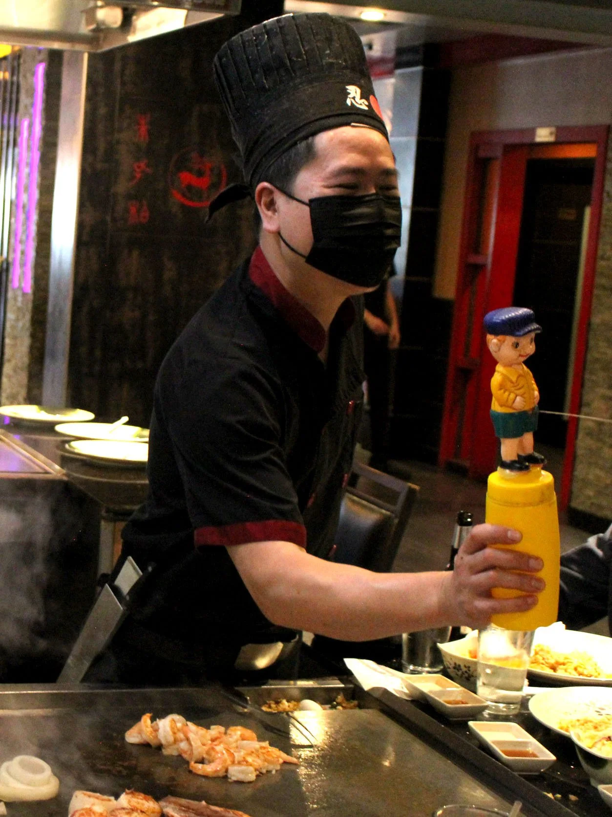 Jeff Lin, a hibachi chef, offers saki from the bottle to customers. The saki squeeze is a recurring tradition at the restaurant to excite dinner parties.